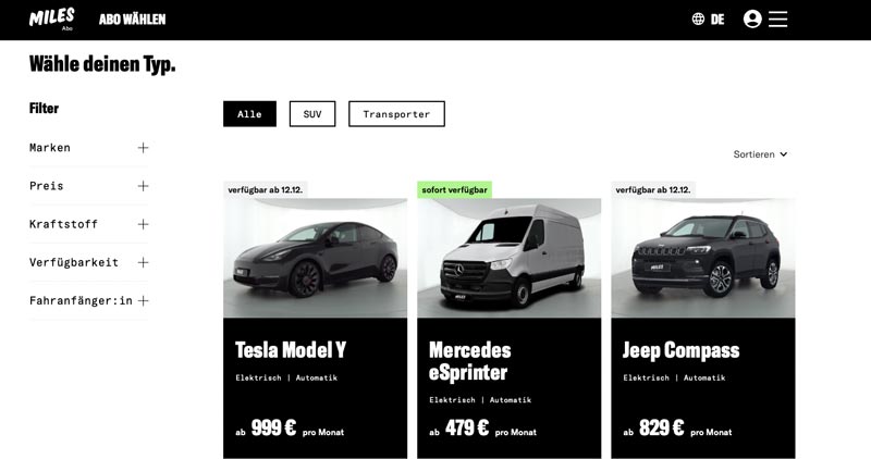 Außerdem kannst du dir bei MILES Abo genau das Auto aussuchen, das du dir wünschst. Bei anderen Anbietern ist es im Gegensatz dazu oft nur möglich, einen bestimmten Fahrzeugtyp auszuwählen.